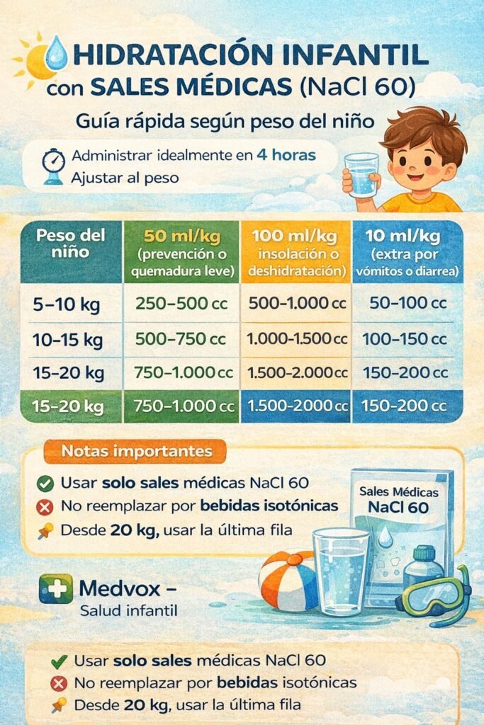 Se adjunta tabla estimativa de los cc a administrar de sales hidratantes sodio 60, a partir de los 20 kg se sigue la última indicación (15-20 kg). Administrar idealmente en cuatros horas, pero siempre dependerá de la tolerancia oral.