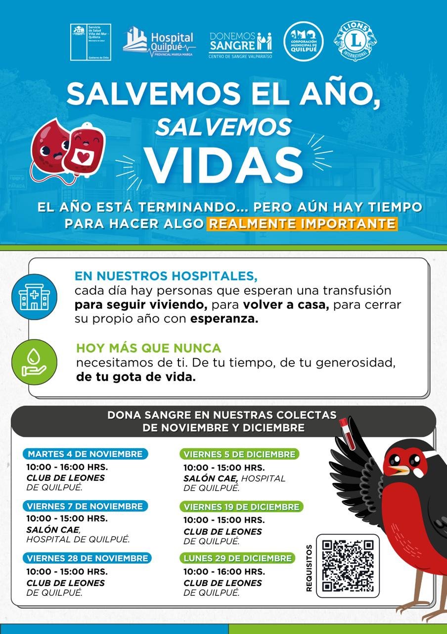 La campaña, organizada por el Hospital de Quilpué junto a Donemos Sangre, el Club de Leones y otras instituciones, detalla cinco jornadas de colecta en noviembre y diciembre: