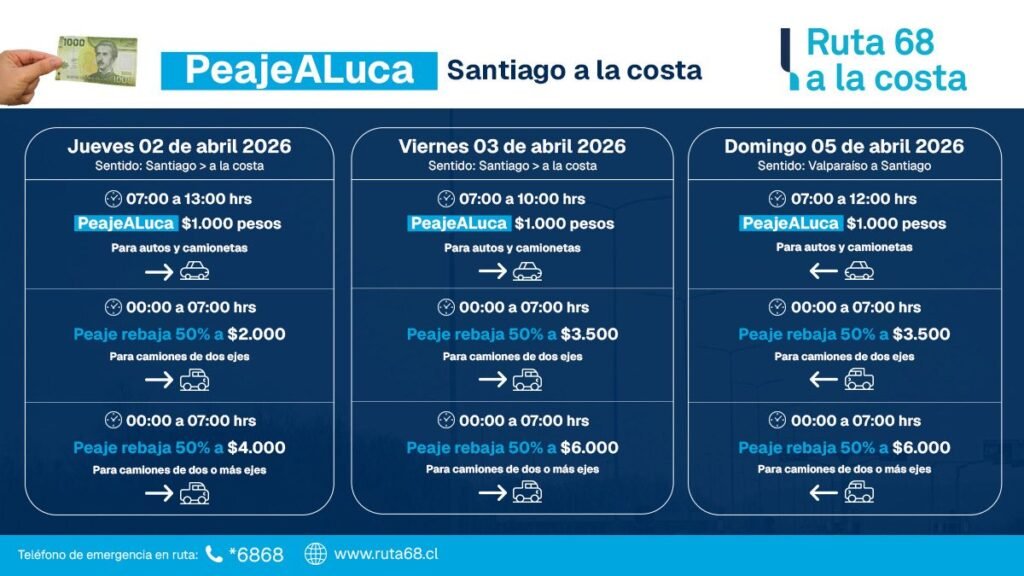 - Viernes 03 de abril de 2026 En el mismo sentido, los autos y camionetas accederán al “PeajeALuca” de $1.000 pesos entre las 07:00 y las 10:00 horas. Los camiones de dos ejes pagarán $3.500 pesos, mientras que los de dos o más ejes tendrán un valor de $6.000 pesos, válido entre las 00:00 y las 07:00 horas.
