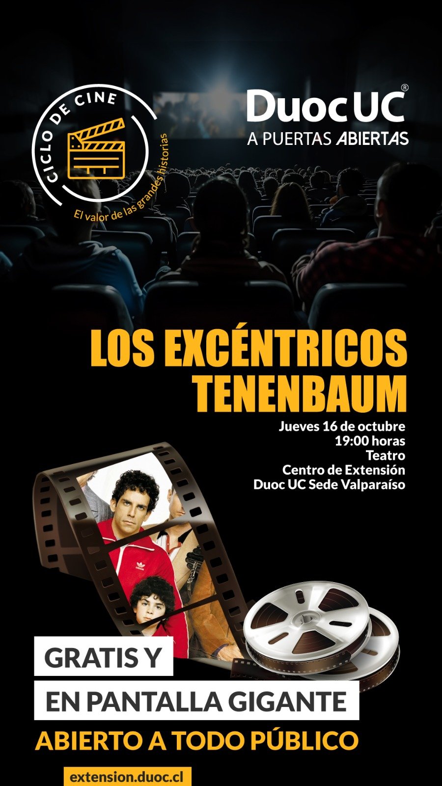 Valparaíso se prepara para recibir una dosis de cine con sello autoral este jueves 16 de octubre, a las 19:00 horas, cuando el Centro de Extensión Edificio Cousiño de Duoc UC se transforme en sala de proyección para exhibir “Los Excéntricos Tenenbaum”, la aclamada película del director Wes Anderson. La función, gratuita y abierta a todo público mayor de 14 años, se enmarca en el ciclo “El valor de las grandes historias”, una iniciativa cultural que busca acercar el arte cinematográfico a la comunidad porteña.