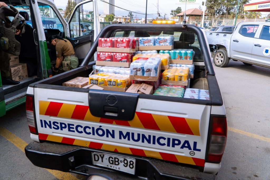 Municipio, Carabineros y SII ejecutaron operativos intersectoriales que dejaron más de dos mil botellas de alcohol decomisadas, estructuras irregulares retiradas y una detención por patente adulterada.